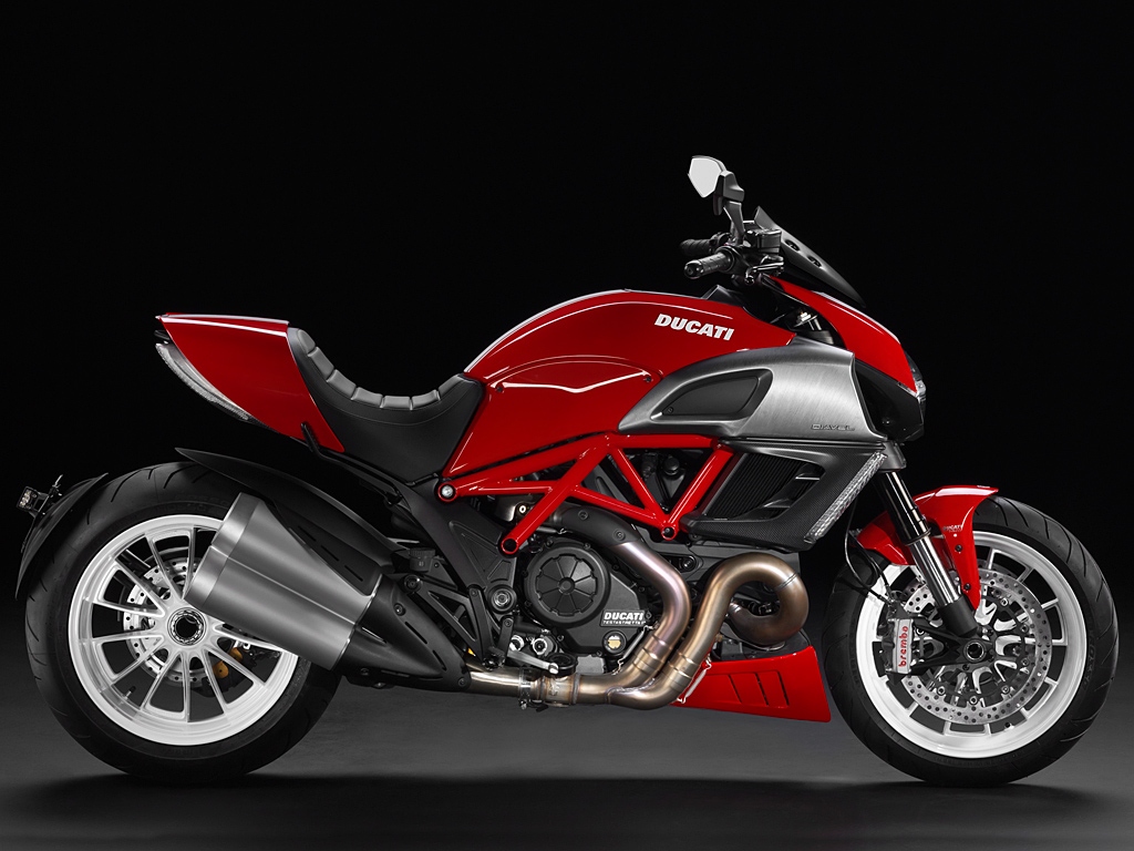 Die Diavel verkörpert Kraft, Leistung und Charakter. Brachiale 162 PS, immer unter Kontrolle dank der drei Riding Modes und des Ducati Sicherheitspakets (ABS + Traktionskontrolle), gepaart mit einem Trockengewicht von lediglich 210 kg, ergeben eine wahrhaft magische Kombination, wie sie nur von Ducati stammen kann. Diavel Konzept Das Diavel Projekt begann mit einem weißen Blatt Papier. Die Ducati Designer füllten es nach und nach mit einem "Wunschzettel". Bis ihre Vorstellung mehr und mehr Gestalt annahm - der Wunsch nach einem flachen Motorrad mit langem Radstand wurde langsam Realität. "Die Herausforderung bestand darin, eine muskuläre Silhouette mit einem reinrassigen Sportmotor zu verbinden. Es waren eisener Wille und Erfindungsreichtum, die schließlich ein Motorrad entstehen ließen das - von vorne betrachtet - wie ein kraftvoller Athlet im Startblock wirkt," erklärt das für das Projekt verantwortliche Ducati Design Team. "Das Vorderrad haben wir nahe am "Körper" der Diavel platziert und mit dem kurzen Heck eines Sportmotorrades kombiniert. So konnten wir, unserer Idee entsprechend, ein muskulöses Bike kreieren und es mit dem passenden Fahrwerk ausstatten." Riding Mode "Die Diavel verkörpert die modernsten und innovativsten Technologien aus der Ducati Entwicklungsabteilung. Allen voran, das Riding Mode Konzept. Über die linke Lenkerarmatur kann zwischen drei verschiedenen, vorprogrammierten Riding Modes gewählt werden - auch während der Fahrt. Die Riding Modes verändern den fahrdynamischen Charakter der Diavel. Unterscheidliche Motormappings werden mit Intensitätsstufen der Ducati Traktionskontrolle (DTC) zu einem ""Fahrmodus"" kombiniert. Im Stadtverkehr liegt die Aufmerksamkeit eher auf Sicherheit als auf Leistung. Der Urban Riding Mode ""zähmt"" den Charakter der Diavel. Die Leistung ist begrenzt auf 100PS und die Traktionskontrolle DTC ist auf Stufe 5 programmiert. So lässt sich selbst der chaotischste Stop-and-go-Verkehr in der Großstadt sicher meistern. Im Touring Riding Mode stehen volle 162PS zur Verfügung, jedoch mit weicherem, gut kontrollierbarem Ansprechverhalten. Die Traktionskontrolle ist auf Stufe 4 eingestellt. Der Touring Mode garantiert eine entspannte, angenehme Fahrt sowie maximalen Komfort für Fahrer und Beifahrer - auch auf längeren Strecken. Der Sport Riding Mode sorgt mit 162PS und feinfühligem Ansprechen der Drosselklappen für maximale Beschleunigung und Adrenalin pur. Für den vollen Genuß des Testastretta 11° Motors ist die DTC im Sport Modus auf Stufe 3 eingestellt und bietet damit Performance nahe an der Haftgrenze." Diavel Design Der Auftritt der Diavel demonstriert Bereitschaft und Dominanz, begründet durch das Vertrauen auf die Überlegenheit. Die seitlich angebrachten Wasserkühler verleihen der Diavel ein breitschultriges, muskulöses Aussehen. Im Bereich des Motors wird das Bike schmaler und setzt sich bei der Bugverkleidung, hinter der sich der Ölkühler befindet, zu einer athletischen Form fort. Ein massiver 240er Hinterradreifen ist das beste Beispiel für die "Kompromisslosigkeit" der Diavel Designer beim erstellen des Lastenheftes. Die schiere Breite des Hinterradgummis ist Ausdruck reichlich vorhandener Kraft und unglaublich stylish, so dass sich unsere Forschungs- und Entwicklungsabteilung sehr bemüht hat, der Diavel -trotz des breiten Hinterradreifens- ein handliches Fahrverhalten angedeihen zu lassen, alleine schon, um damit ein kleinen seismischen Schock innerhalb der Motorradindustrie zu verursachen. Die Diavel ist eine wahrhafte Ducati, geboren aus der Leidenschaft fürs Motorradfahren und entworfen, um in jeglicher Hinsicht die authentische Ducati Performance zu bieten. Seitlich positionierter Wasserkühler Die technischen Lösung, die für eine möglichst klare Linienführung an der Front der Diavel sorgt, sind die zwei seitlich angebrachten, hocheffizienten Wasserkühler. Diese beiden Kühler sitzen seitlich, unterhalb des Kraftstofftanks. Die ausgeklügelte Aerodynamik ermöglicht einen optimalen Lufstrom. Falls notwendig sorgen elektrische Lüfter für die nötige Unterstützung. Das Design kombiniert Form und Funktion und unterstreicht die muskulöse Linie des Motorrads. Auspuffanlage Für eine verbesserte Leistungsabgabe haben die Krümmer beider Zylinder identische Baulängen. Die Krümmer mit 58mm Durchmesser sind Teil der 2-in-1-in-2 Auspuffanlage, die bei der Diavel für eine effiziente Leistungsabgabe sorgt. Teil des Motormanagements ist eine Lambdasonde für jeden Zylinder, die eine selektive und präzise Kraftstoffversorgung ermöglichen. In den massiven, doppelläufigen Endschalldämpfern sind die Katalysatoren mit untergebracht. Eine elektronisch geregelte Auspuffklappe optimiert den Abgagsgegendruck über den gesamten Drehzahlbereich und sorgt dadurch für optimale Leistungs- und Drehmomentabgabe des Motors. Testastretta 11° Das "Herz" der Diavel ist der Ducati Testastretta 11° Motor. Seine Wurzeln hat der Testastretta 11° in der Entwicklungsabteilung des Ducati Corse Rennstalls. Ducatis Testastretta 11° Motor verbindet die immense Kraft der Superbike-Motoren mit einer gleichmässigen und gut kontrollierbaren Leistungsentfaltung. Ein großer Schritt nach vorn, um die überragende Performance mit genußvollem Fahren zu verbinden. Um die brutale Kraft auch unangestrengt, komfortabel und entspannt fahrbar zu machen, hat Ducati die Steuerzeiten des Ventiltriebs überarbeitet und die Ventilüberschneidung geändert. Unter Ventilüberschneidung versteht man das Intervall der Kurbelwellenumdrehung, in dem sowohl Einlaß-, als auch Auslaßventile gleichzeitig geöffnet sind. Diese Ventilüberschneidung dauert von Ende des Auslaßtaktes bis zum Beginn des Einlaßtaktes. Hochleistungsmotoren, bei denen für eine maximale Leistungsausbeute auf sanftes Ansprechverhalten verzichtet wird, weisen ein Höchstmaß an Ventilüberschneidung auf. Sie profitieren von den Druckwellen der Gassäulen im Motor u