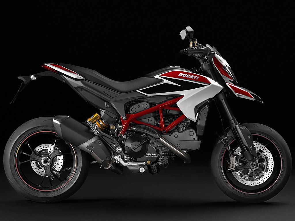 Ein erhöhtes Set-up, geschmiedete Marchesini Felgen, voll einstellbare Federelemente, mit ultraleichter Aluminium-Gabel von Marzocchi und Öhlins-Federbein, sorgen für ein außergewöhnliches Leergewicht von 171 kg. ABS und Traktionskontrolle sind serienmäßig, so können Sie sich auf Ihren Fahrspaß konzentrieren. Und die aufregende Ducati Corse Lackierung unterstreicht: Die Hypermotard SP ist ein kompromisslos sportliches Motorrad, bereit, jede Herausforderung anzunehmen! Design "Das Design der neuen Hypermotard Familie entspringt der allerneuesten Generation, um, genauso wie bei der allerersten Version, ein atemberaubendes Motorrad für maximalen Fahrspaß bieten zu können. Der originale Look mit Dirt-Bike Inspiration ist nun noch temperamentvoller, mit sichtbar gesteigerter Bodenfreiheit, dem angehobenen und geschärftem Heck und den schmäleren Flanken. Dies sind die charakterbildenden Stilelemente der neuen Version, die das Motorrad ideal für den täglichen Weg zur Arbeit, für lange Strecken oder für einen elektrisierenden Tag auf der Rennstrecke machen. Die neue Hypermotard behält den für Offroad Modelle typischen Handschutz bei und bietet überarbeitete und neu designte Rückspiegel, die sich perfekt in das aufgeräumte Design einfügen und dem Anspruch des städtischen/urbanen Einsatzes dieses Modells Ausdruck verschaffen. Das besondere Augenmerk auf fließenden Linien erlaubt es, das wesentliche und minimalistische Erscheinungsbild dieser Familie aufrecht zu halten, ungeachtet der Komplexität und der Herausforderung, den neuen flüssigkeitsgekühlten Ducati Testastretta 11° Motor mit 821 cm³ in das Motorrad zu integrieren. Die neue Hypermotard Familie zeichnet sich durch ihre Proportionen, Ergonomie und Handlichkeit, sowie durch die Anwendung der neuesten Ducati Technologien aus. Während jedoch die Versionen Hypermotard und Hypermotard SP treu den grundlegenden Supermoto-Look beibehalten, wirkt die Hyperstrada weniger extrem, bietet sie doch einige besondere Merkmale eines Tourenmotorrads." Hypermotard SP Die Hypermotard SP, die extremste Version der Familie, greift alle technischen Besonderheiten der Hypermotard auf und steigert diese um ein Weiteres, um selbst die erfahrensten und anspruchsvollsten Fahrer, die stets auf der Suche nach dem Maximum an Leistung sind, zu begeistern. Das Alles bei maximaler Sicherheit, denn die Hypermotard SP ist im Rahmen des Ducati Safety Pack (DSP) serienmäßig mit ABS und DTC ausgestattet. Das SP Modell, in purem Racing-Stil, bietet neben den unvergleichlichen Riding Modes auch Fahrwerkselemente mit längerem Federweg, für ein echtes Supermoto-Setting. Mit einer Bodenhöhe von stolzen 210mm und einer möglichen Schräglage von bis zu 47,5° garantiert die „böseste" Version der Familie maximales Fahrvergnügen ohne Grenzen. Die Hyper-Geschichte Bei der Präsentation der Studie Hypermotard auf der Mailänder Messe im Jahre 2005 war klar, dass dies die Gründung eines neuen Segments ist, das die Perfektion der Superbikes mit dem minimalistischen Stil der Supermotos vereint. Dennoch gab es bei manchen in Ducati Bedenken, ob der Markt für dieses neuartige Konzept bereit war. Ungeachtet aller Vorbehalte wurde die Entwicklung dieses Projektes mit der Überzeugung vorangetrieben, ein Motorrad mit einer aufrechten Sitzposition kreieren zu wollen, das die Handlingseigenschaften eines „Dirtbikes" bietet und dennoch mit einem anderen Motor als dem gewöhnlichem Einzylinder ausgestattet ist. So kam es, dass sich die Ingenieure von Ducati an die Entwicklung eines Motorrads machten, das die Agilität, Präzision und Leichtigkeit eines Supermoto mit den raffinierten Besonderheiten der Ducati Superbikes vereint, angetrieben von dem leistungsstarken und charismatischen Zweizylinder in L-Form. Mit der Einführung der Hypermotard im Jahre 2007 entstand eine neue „Cross-Over" Kategorie: Extremes Fahrvergnügen, neu erfunden in einem Motorrad für den alltäglichen Gebrauch. Das Jahr 2013 stellt den neuesten Meilenstein dieser Evolution dar: Ducati präsentiert die neue und aufregende Generation der Hypermotard, die das Erbe des ursprünglichen Konzepts mit den Elementen fortführt, die dieses Motorrad derart einzigartig und erfolgreich machten: Innovation, Design, aber insbesondere extremer Fahrspaß. Die neue Hypermotard greift diese Merkmale nicht einfach nur auf, sondern legt die Messlatte dank der neuen Reihe mit 3 unglaublichen Modellen noch ein ganzes Stück höher: Die mitreißende Hypermotard, die extreme Hypermotard SP und einem neuen, noch vielfältigerem und praktischerem Tourer, speziell entwickelt für mittellange Touren: Die Hyperstrada. Neuer Testastretta 11° Die neue Hypermotard Familie verabschiedet sich von der Konfiguration mit 2 Ventilen und kommt mit einem neuen flüssigkeitsgekühlten Triebwerk mit 4 Ventilen pro Zylindern, das mit einem Verhältnis von Bohrung zu Hub von 88 mm x 67,5 mm besticht und für das perfekte Gleichgewicht zwischen Alltagstauglichkeit und Leistung entwickelt wurde: Die Rede ist hier vom neuen 821 cm³ Testastretta 11° Motor mit einer Leistung von maximal 110 PS bei 9.250 U/min und einem Drehmoment von 89 Nm bei 7.500 U/min. Der neue Testastretta 11° übernimmt technische Lösungen, die direkt das technische Know-how der Ducati Ingenieure widerspiegeln und einen extrem flüssig und regelmäßig laufenden Motor an den Tag bringen: Der Ventilüberschneidungswinkel von 11° bekräftigt die hervorragenden Ergebnisse der Multistrada 1200 Familie, verbessert die Aus- & Einlassphasen und mündet in einem regelmäßigeren Lauf im unteren und mittleren Drehzahlbereich; die neu angeordneten Einspritzdüsen leiten den Kraftstoff, wie bei der Multistrada 1200, direkt auf die thermisch stark beanspruchte Rückseite des Einlassventils und sichern somit die vollständige Zerstäubung des Kraftstoffs; ein Sekundärluftsystem, ähnlich dem der 1199 Panigale, erlaubt es, den Motorlauf dank der kontrollierten E