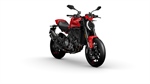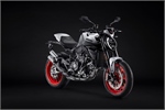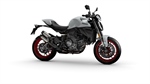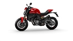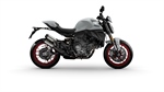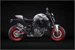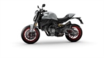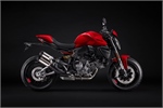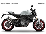 Die fünfte Monster-Generation basiert auf neuem Aluminium-Monocoque, V2-Motor und High-End-Komponenten: 111 PS (81,6 kW) bei 9.000 U/min, 91,1 Nm bei 7.250 U/min, 175 kg fahrfertig ohne Sprit (4 kg leichter als Vorgänger). Die Monster+ ergänzt serienmäßig Windscreen und Soziussitzabdeckung zur Basis; Pirelli Diablo Rosso IV (120/70-17 vorn, 180/55-17 hinten), Brembo M4.32 an 320-mm-Doppelscheibe vorn, Showa 43-mm-USD-Gabel (130 mm Federweg) und Monoshock (145 mm). 6-Achs-IMU mit Cornering ABS, DTC (8 Stufen), DWC (4 Stufen), EBC (3 Stufen), DQS 2.0 und vier Riding Modes (Sport, Road, Urban, Wet).