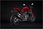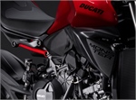 Monocoque-Rahmen (4 kg) mit V2 als Stressed Member, Doppelseiten-Alu-Schwungarm (Panigale-inspiriert), 1.492 mm Radstand, 23,3°/92 mm Geometrie für intuitive Einlenkung und Stabilität. Showa 43-mm-USD-Gabel und Monoshock (Vorspannung einstellbar) balancieren Komfort und Sport; Guss-Aluräder minimieren Masse. Brembo M4.32-Monoblocks (modulierte Beläge) an 320/245-mm-Scheiben mit Cornering ABS liefern präzise Bremskraft; 180/55-Hinterreifen favorisiert Agilität in Kurven und Stadt.