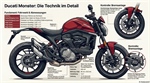 Die komplett neue Monster basiert auf Aluminium-Monocoque, V2-Motor und Premium-Komponenten: 111 PS (81,6 kW) bei 9.000 U/min, 91,1 Nm bei 7.250 U/min, 175 kg fahrfertig ohne Sprit (4 kg leichter). Pirelli Diablo Rosso IV (120/70-17 vorn, 180/55-17 hinten), Brembo M4.32 an 320-mm-Doppelscheibe vorn, Showa 43-mm-USD-Gabel (130 mm) und Monoshock (145 mm, Vorspannung einstellbar). 6-Achs-IMU steuert Cornering ABS (3 Stufen), DTC (8 Stufen), DWC (4 Stufen), EBC (3 Stufen), DQS 2.0 und vier Riding Modes (Sport/Road/Urban/Wet).