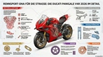 Aerodynamik aus MotoGP: Corner Sidepods (Ground Effect bei Neigung), größere Biplane-Flügel (+25% Downforce bei 270 km/h), Ducati Red Livery mit Carbon-Details (Türchen, Kupplungsdeckel). Gebürstetes Alu-Tank, Front Frame/Schwinge in Schwarz, kompakte Form mit 1.477 mm Radstand; Single-Seater-Konfig mit Spiegelausdrehstücken und Kennzeichenstopfen. Dynamische Ansaugkanäle und 17-l-Tank unterstreichen Rennstrecken-Ästhetik.