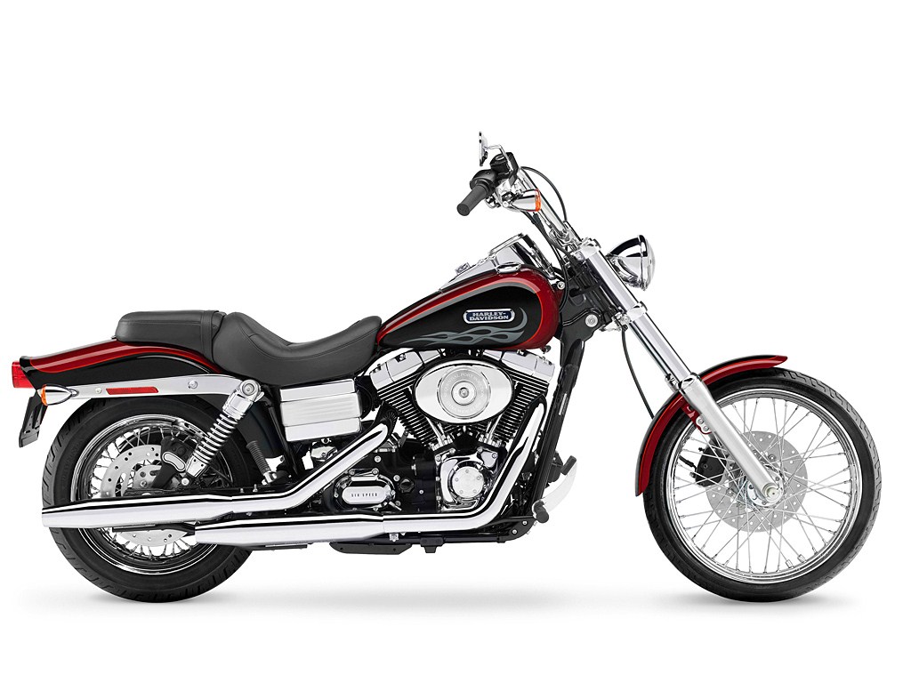| Harley-Davidson FXDWGI Dyna Wide Glide Mit der FXDWGI Dyna Wide Glide lotet Harley-Davidson bei der Neu-Interpretation der Chopper-Philosophie die Grenzen des Zulassungsrechts konsequent aus. Die Wide Glide ist 2006 länger als je zuvor, denn die neue Telegabel mit 49 Millimeter Standrohrdurchmesser weist einen Gabelwinkel von 36 Grad auf und führt ein Profile Drahtspeichenrad im 21-Zoll-Format. Der Bobtail Heckfender erhält eine neue Linienführung, die den breiteren 160-Millimeter-Hinterreifen optisch hervorhebt, und trägt eine neue Stufensitzbank im Chopper-Stil. Der neue 1,25-Zoll starke Apehanger Lenker auf neuen kurzen Risern sorgt ab Werk mit innen geführten Kabeln für eine aufgeräumte Gabelbrücke. Die Federbeine tragen neue geschmiedete Abdeckungen. Zwölf Lackfarben stehen für die Wide Glide zur Wahl, darunter Metallic- und Zweifarb-Kombinationen. Harley-Davidson FXDWGI Dyna Wide Glide Daten: Schwingungsentkoppelter Twin Cam 88 Motor mit ESPFI Schwarz pulverbeschichteter Motor mit verchromten Abdeckungen Verchromte Staggered Shorty Dual Auspuffanlage Neues Cruise Drive Sechsgang-Getriebe Neue Telegabel mit 49 Millimeter Standrohrdurchmesser Neu: Gabelwinkel 36 Grad, Lenkkopfwinkel 34 Grad Neuer 160 Millimeter breiter Hinterreifen Profile Drahtspeichenrad vorn im 21-Zoll-Format Neuer 1,25-Zoll starker Apehanger Lenker mit Kabelinnenführung Neue, kürzere Riser Neuer Bobtail Heckfender Neues, formschönes Batteriegehäuse Vorverlegte Fußrastenanlage Großer Tachometer in der Tankkonsole Diebstahlwarnanlage mit Wegfahrsperre serienmäßig | |