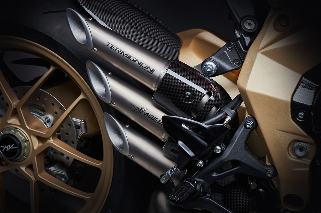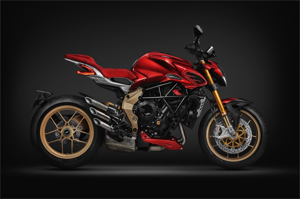 Das Fahrzeug wird in einer exklusiven Serie von nur 300 Einheiten gefertigt und kombiniert das ikonische Design mit neuen technologischen Ansätzen, einschließlich eines 931cc-Dreizylindermotors, Voll-Öhlins-Fahrwerk, Brembo Hypure-Bremsen und einem Titan-Termignoni-Slip-On. Zusätzlich setzt die Brutale Serie Oro mit einer 5-Jahres-Garantie neue Maßstäbe für Zuverlässigkeit und Wertbeständigkeit.
