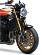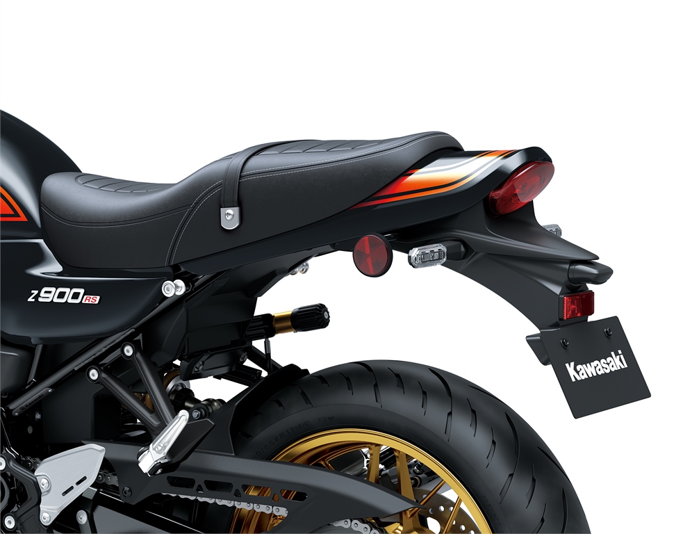 Die SE-Variante verfügt über ein Brembo-Bremspaket mit vorderen Bremssätteln und Bremsscheiben (ø 300 mm). Dazu kommen Stahlflexleitungen sowie ein hochwertiges Öhlins-Federbein, das sich bequem über ein Handrad am Rahmen einstellen lässt. Auf der rechten Seite des Lenkers befindet sich außerdem ein USB-C-Anschluss. Die gesamte Optik der Z900RS SE ist an das legendäre „Fireball“-Design angelehnt, jedoch mit orangefarbenen Seitenflächen auf metallic-schwarzem Grundton. Das Standardmodell ist in einem komplett schwarzen „Blackball“-Design mit Retro-Emblemen auf den Seitendeckeln und dem Motor erhältlich. Eine weitere Option ist das Candy Tone Red, das eine Anspielung auf die Farbgebung der Z1B von 1975 darstellt.
