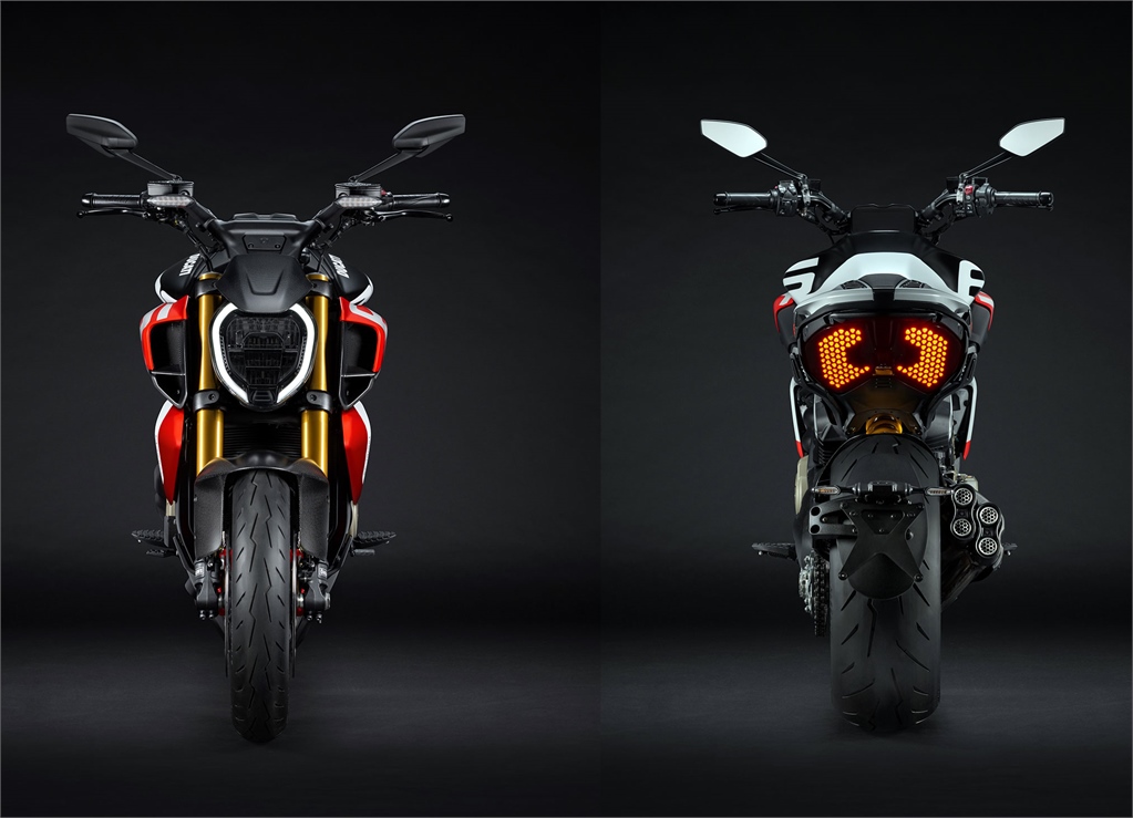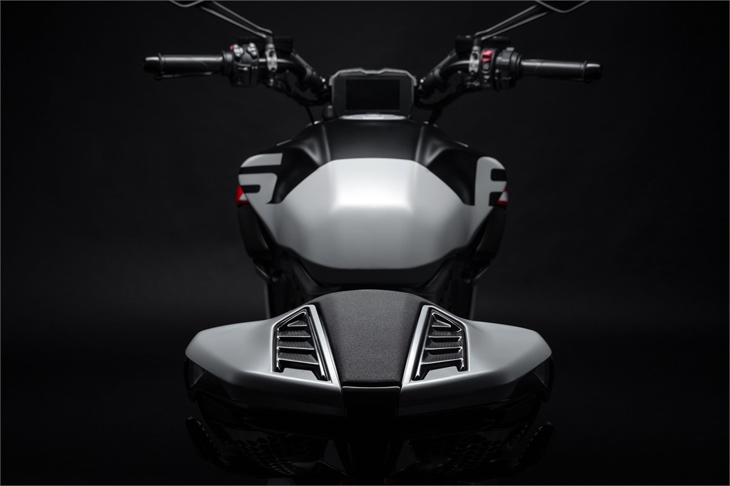 Die RS-Linie repräsentiert den Geist von Ducati: Die Diavel V4 RS kann sich mit ihrer aggressiven Silhouette deutlich von der Standard-Diavel absetzen. Die exklusive „RS“-Lackierung zieht den Blick auf sich, grafisches Highlight ist das prominent platzierte RS-Logo auf der Verkleidung, dem Schlüssel und der Zylinderbank samt Seriennummernplakette. Das Design umfasst Carbon-Elemente, die nicht nur die Optik, sondern auch das Gewicht optimieren – etwa die Front- und Heckkotflügel, Verkleidung, Tankabdeckungen, Air Intakes und die Mono-Sitzbankabdeckung. Die optische Leichtigkeit der Heckpartie, die markante Auspuffoptik mit Titan-Endkappen und die roten Bremssättel von Brembo Stylema setzen den sportlichen Charakter der Diavel V4 RS ins Rampenlicht. Im vorderen Bereich dominieren breite Air Intakes und Scheinwerfer im tiefgezogenen Flyscreen aus Carbon.