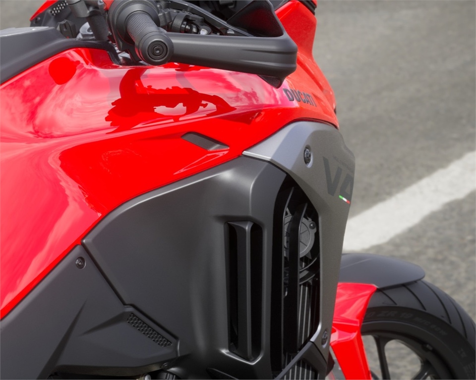 Das Design der Ducati Multistrada V4 bleibt klar der Familientradition verpflichtet und verbindet dynamische Linien mit funktionaler Ergonomie. Auffällig ist die Feinjustierung der Aerodynamik, die an Flügelprofilen inspirierten Lufteinlässe wurden verkleinert und aerodynamisch optimiert. Ziel dieser Maßnahmen: geringere Turbulenzen rund um Helm und Schultern, bessere Kühlung von Motor und Bremsanlage und eine harmonischere Linienführung.