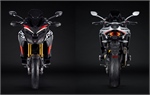 - Frontpartie: Schmaler, aggressiver LED-Doppelscheinwerfer mit integriertem Tagfahrlicht signalisiert sofort sportliche Herkunft. Die markanten Winglets erinnern stark an die Panigale und sorgen zudem für aerodynamischen Abtrieb.