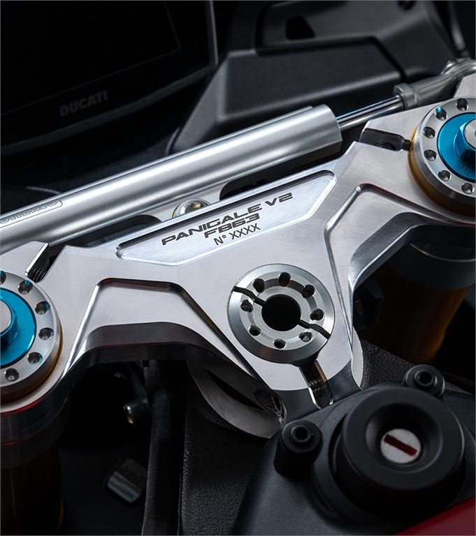 Das integrierte Monocoque-Rahmenkonzept mit Aluminium-Schmiederädern, voll einstellbarer Öhlins-Gabel und Federbein sowie Brembo Monoblock M50-Bremssätteln vorne mit 320 mm Scheiben positionieren die FB63 als eine der exklusivsten und hochwertigsten Panigale V2-Varianten.