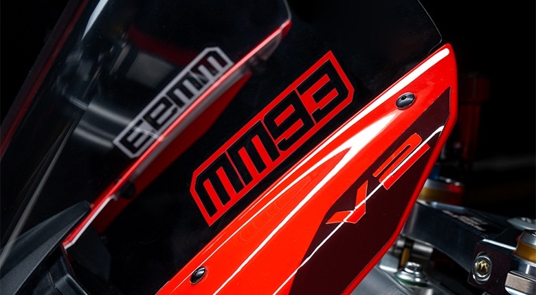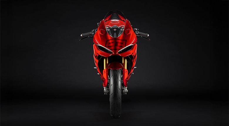 Die Panigale V2 MM93 begeistert durch eine auf Marc Marquez abgestimmte Grafik und Farbgebung, die den Stil des mehrfachen Weltmeisters widerspiegelt. Der Monocoque-Aluminiumrahmen ist sichtbar und trägt zum sportlichen Erscheinungsbild bei.