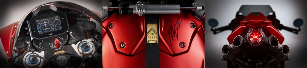 Die Ergonomie kombiniert modernen Komfort mit Rennsport-Agilität. Der Sitz ist ein Mix aus echtem Leder und Alcantara mit lasergraviertem Agostini-Motiv. Spezielle Details wie goldfarbene Plaketten an Lenker und Rahmen sind in jedem der 83 Exemplare nummeriert.