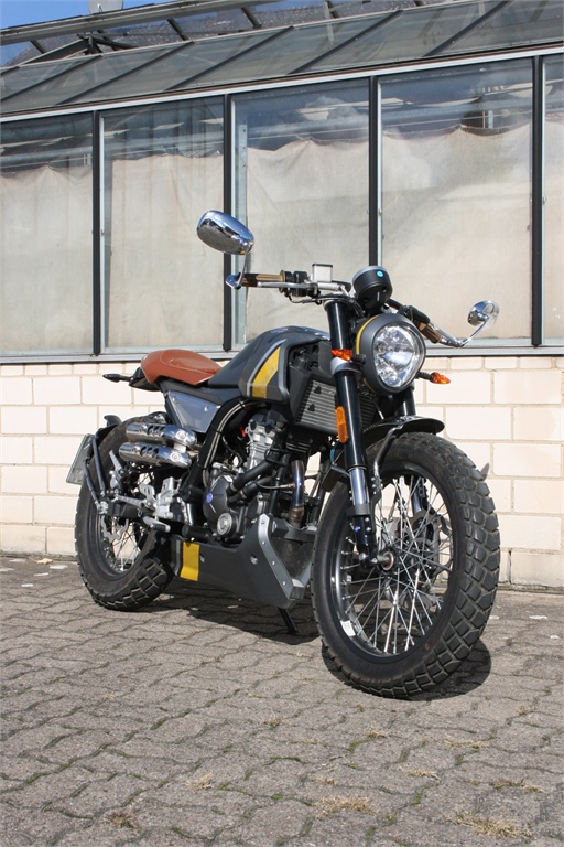 Mondial tituliert seine HPS als Scrambler. Dafür steht zumindest der rechtsseitig hochverlegte Doppelrohr-Auspuff, der ungewöhnlich kurz ausfällt. Die Hitzeschilde haben allerdings den Nachteil, dass sie das Bein etwas weit nach außen schieben und so der Fuß nicht optimal zum Bremspedal liegt. Der üppige Motorspoiler und der flache, leicht nach innen gebogene Lenker sind allerdings nicht artgerecht. Dazu kommt eine einsitzige Höckerbank, die eher zu einem Café Racer passt (und die Frage aufwirft, warum es trotzdem Soziusfußrasten gibt). Das Gesamtbild ist dennoch absolut stimmig und auch erwachsene Fahrer fühlen sich auf der HPS nicht überdimensioniert.