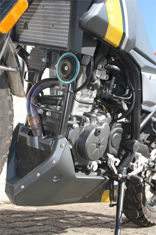 Das Sechs-Gang-Getriebe arbeitet äußerst sauber. Die Combi-Bremse hingegen gehört zur eher zahnloseren Sorte, die Verzögerungswerte gehen letztendlich aber in Ordnung. Beim etwas gröber profilierten Dual-Purpose-Reifen (Made in China) müssen in der Vorderradführung leichte Abstriche gemacht werden. Der 18-Zöller trifft nicht immer ganz die Linie, doch die Abweichungen sind minimal und auf einem für Leichtkrafträder absolut tolerierbarem Niveau. Mit Upside-down-Gabel und Ausgleichsbehältern an den Federbeinen gibt es an der sonstigen Fahrwerksausstattung hingegen nichts auszusetzen.