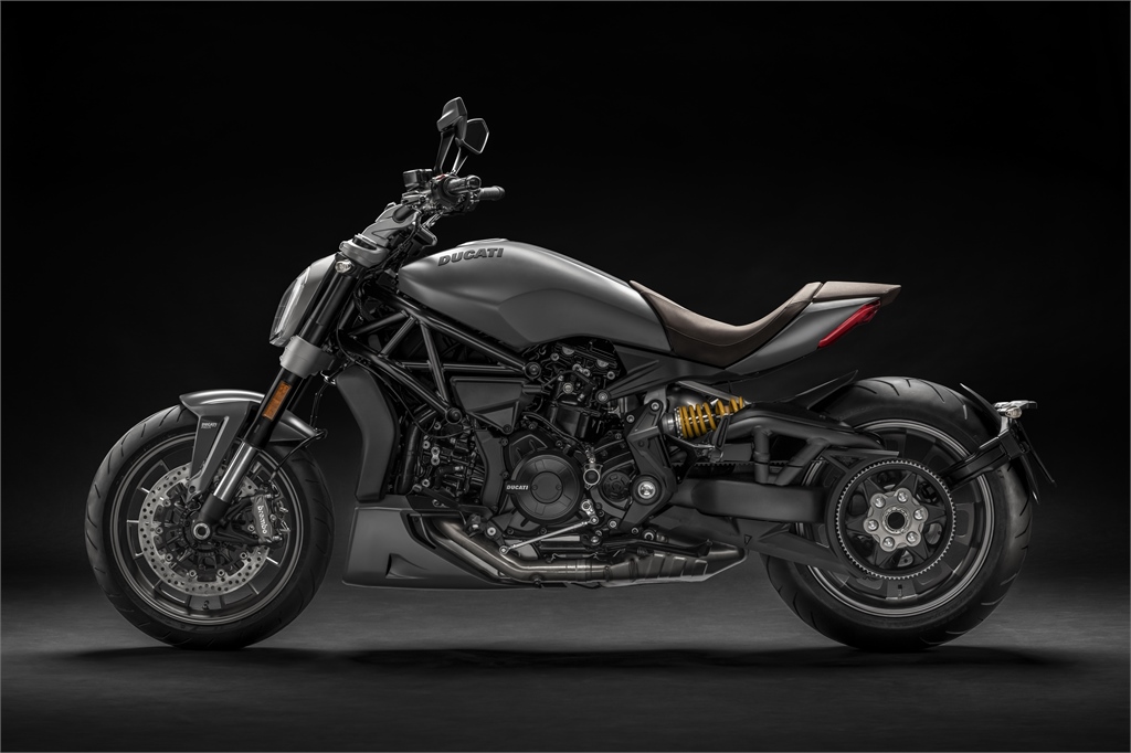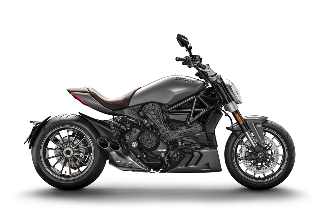 Die S-Version verfügt über einen Scheinwerfer mit DRL (Daytime Running Light), DLC-beschichtete Gabelrohre, Brembo M50-Bremssättel vorne, maschinelle bearbeitete Felgen und Zahnriemenabdeckungen. Die XDiavel S ist weiterhin in den Farben “Thrilling Black” und “Iceberg White” erhältlich – beide Farbvarianten ziert nach wie vor ein roter Streifen, der den Tank so auffällig macht.