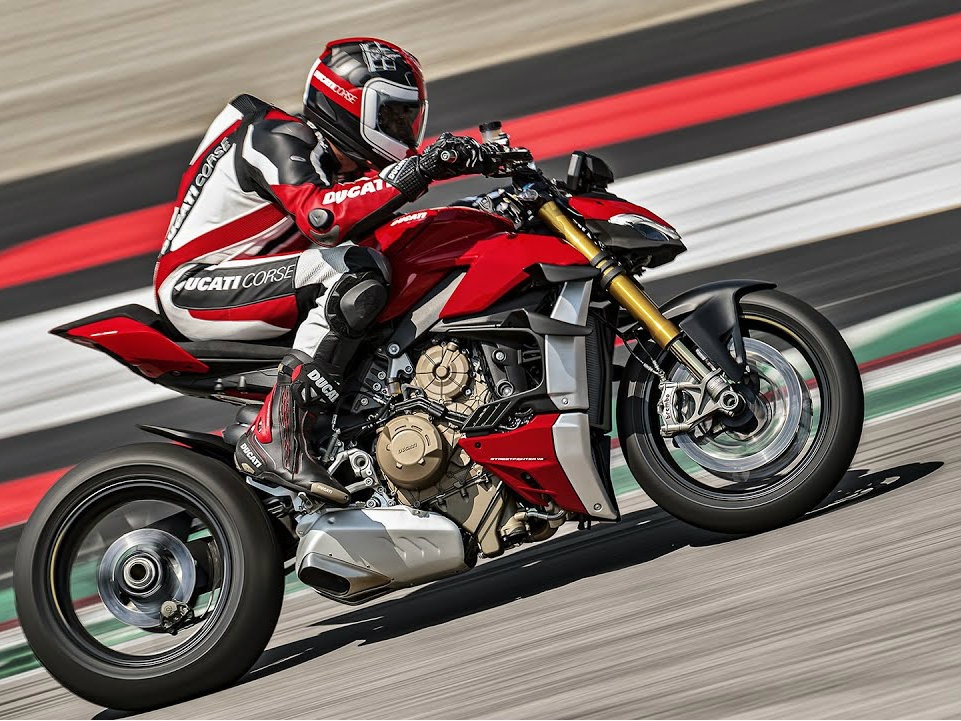 Ein weiteres Naked-Bike der Superlative aus der Ducati-Schmiede in Bologna: 208 PS bei 12.750/min leistet der 90-Grad-V4-Motor mit 1.103 ccm Hubraum in der Streetfighter V4. Das maximale Drehmoment gibt Ducati mit 123 Nm bei 11.500/min an. Die Ducati Streetfighter V4 und die V4 S - Letztere zusätzlich mit Schmiederädern, elektronisch verstellbarem Fahrwerk sowie Lenkungsdämpfer - sind trotz des grinsenden LED-Scheinwerfers erkennbar die Töchter des Superbikes Panigale V4: nur ohne Verkleidung, mit einer aufrechteren Sitzposition und einem höheren, breiteren Lenker. Die Doppeldecker-Flügelchen bringen bei maximal 270 km/h spürbar Abtrieb und sollen für Spurstabilität sorgen.