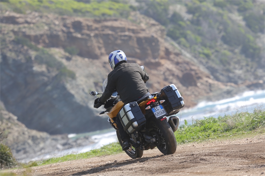 Nach dem Grundmodell und der Caponord Travel Pack soll die Rally die Spitzenposition besetzen. Dafür blieb es nicht nur bei den äußeren Unterscheidungsmerkmalen, zu denen auch ein minimal verlängerter Radstand gehört. Eine leicht modifizierte Gabel und das spezielle Setting von ABS und der dreistufigen Traktionskontrolle sollen den Offroad-Ausritt ebenfalls erleichtern. So gelingt es auch weniger versierten Fahrern, mit erstaunlicher Leichtigkeit und sehr sicherem Gefühl über den Schotter oder durch den Wald zu fegen. Dafür bedient man sich auch gerne des „Rain"-Modus' aus den drei hinterlegten Fahrprogrammen, der dank Ride-by-Wire-Technologie und um 20 Prozent gekappter Spitzenleistung keine hektischen Ausrutscher am Gasgriff zulässt.